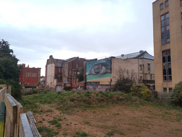 As you can see my site is located in between two buildings, and I am not sure if any of them is currently is in use. It looks like one of them are or have been an art studio space of some sort and the other one is still a mystery. I know that queens hotel is one building away and the parking lot and garden is in the back. The yellow high rise building is residential.